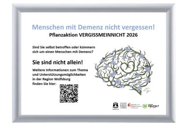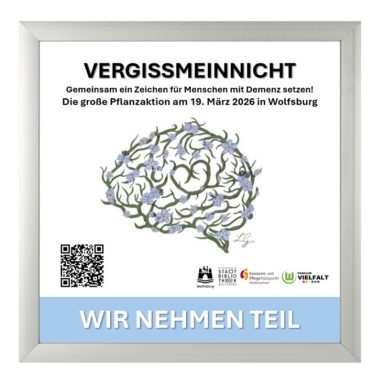 Gemeinsam mit den Senioren*innen möchten wir die Senioreneinrichtungen mit den Blumen verschönern, z. B. mit Pflanzschalen auf dem Empfangstresen oder im Wartebereich, Kübel im Eingangsbereich bis hin zu ganzen Flächen in den Gärten. Auch die Stadt Wolfsburg wird ein Zeichen der Solidarität setzen und Flächen vor dem Rathaus mit den blauen Blüten bepflanzen. Informationstafeln mit einem QR-Code werden dazu aufgestellt, um weitere Informationen zum Krankheitsbild und zu den regionalen Anlaufstellen zu erhalten.